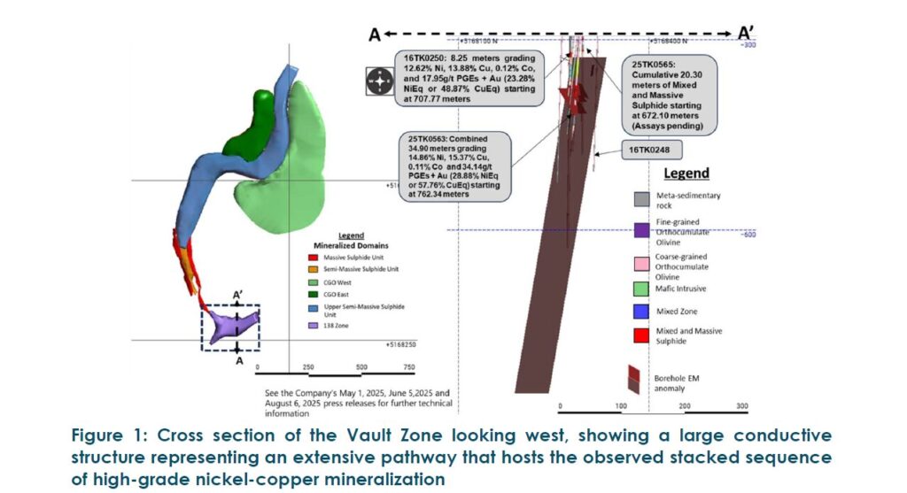 Since August, directional drilling at the Tamarack Nickel-Copper Project, carried out by one crew operating between two drill pads, targeted holes 25TK0563A, 25TK0565A and the extension of historic hole 16TK0248 (originally drilled in 2016) to collect BHEM data. Unfortunately, drill hole 25TK0565A was lost before target depth due to mechanical failure. With drilling at Talon’s Michigan Boulderdash discovery halted for the Winter 2025/2026 snow season, all three drill rigs that were in Michigan and Talon’s full in-house exploration team have been relocated to Tamarack. The expanded program is operating from three dedicated drill pads and is focused on the rapid delineation of resources within the Vault Zone.Significant Geophysical and Geological Indicators