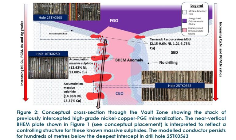 BHEM surveys from the extension of historic drill hole 16TK0248 identified a high-conductivity plate interpreted to represent the lateral continuation of the high-grade nickel-copper-PGE mineralization intersected in drill hole 25TK0563. This response aligns with high-conductivity plates modeled from drill holes 25TK0563 and 25TK0562 (see Figure 1), together supporting the interpretation of continuous massive sulphide mineralization along this stratigraphic level (see conceptual illustration of accumulations of massive sulphides based on drilling to date in Figure 2). BHEM surveys from drill hole 25TK0565 and from the deepening of historic drill hole 16TK0250 (see Figure 1) also indicate potential lateral continuity of massive sulphides, this time within the upper parts of the stratigraphy (see conceptual illustration of accumulations of massive sulphides based on drilling to date in Figure 2). Unlike the Tamarack Resource Area, the extension of drill hole 16TK0248 also modeled a weaker near-vertical conductor extending more than 300 meters below the deepest massive sulphide intercept in the Vault Zone. Together, these results reinforce the emerging model for the Vault Zone, in which massive sulphides accumulated in multiple repeating stacks developed along the contact between the intrusion and the surrounding sediments. At this boundary, heat from the intrusion partially melted the country rock, creating permeable zones (traps) that allowed sulphides to migrate and concentrate. For comparison, a single stack of the massive sulphide unit (MSU) in the Tamarack Resource Area formed in similar geological setting and has a lateral continuation for up to approximately 600 meters. The newly identified near-vertical, low-conductivity detected in 16TK0248 is interpreted to represent a connective pathway—indicating that the repetitive process of sulphide accumulation and lateral extension along stacks may repeat for more than 300 meters below the deepest known intercepts in the Vault Zone. To date, there has been no drilling on the northern part of the intrusion in the Vault Zone (see Figure 2), where the system remains completely open for discovery. At the Tamarack Resource Area, massive sulphides accumulate on both sides of the intrusion—forming two distinct limbs of mineralization developed along the western and eastern contacts (see plan view in Figure 1). This geometry will guide the Talon exploration team to evaluate the opposite, undrilled side of the intrusion at the Vault Zone for potential stacks of massive sulphides.