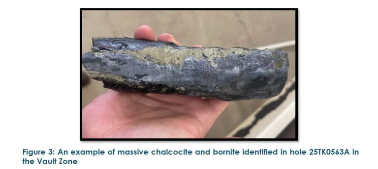 Additionally, results from drill hole 25TK0563A have identified the highest occurrences of chalcocite veining and bornite-chalcopyrite assemblages, minerals not typically observed at the Tamarack Nickel Copper Project, indicating significant copper enrichment over a span of approximately 150-meters between drill holes in the Vault Zone. This hypogene-style enrichment points to a unique geological process, not seen in the Tamarack Resource Area, enhancing the copper potential of the system (see Figure 3).