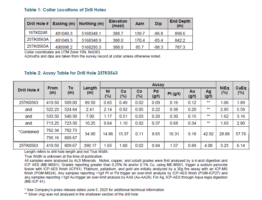 Building on partial results disclosed on June 5, 2025, the remaining assays from drill hole 25TK0563 include 89.50 meters grading 1.06% NiEq (1.89% CuEq) starting at 419.5 meters depth (see Table 2). When combined with the previously reported 34.9 meters of massive sulphide mineralization grading 28.88% NiEq (57.76% CuEq), the drill hole returned a total of 390.17 meters grading 3.23% NiEq (6.14% CuEq) –the highest nickel-equivalent grade multiplied by length interval ever recorded at the Tamarack Nickel-Copper Project.Full Exploration Team Returns to Tamarack