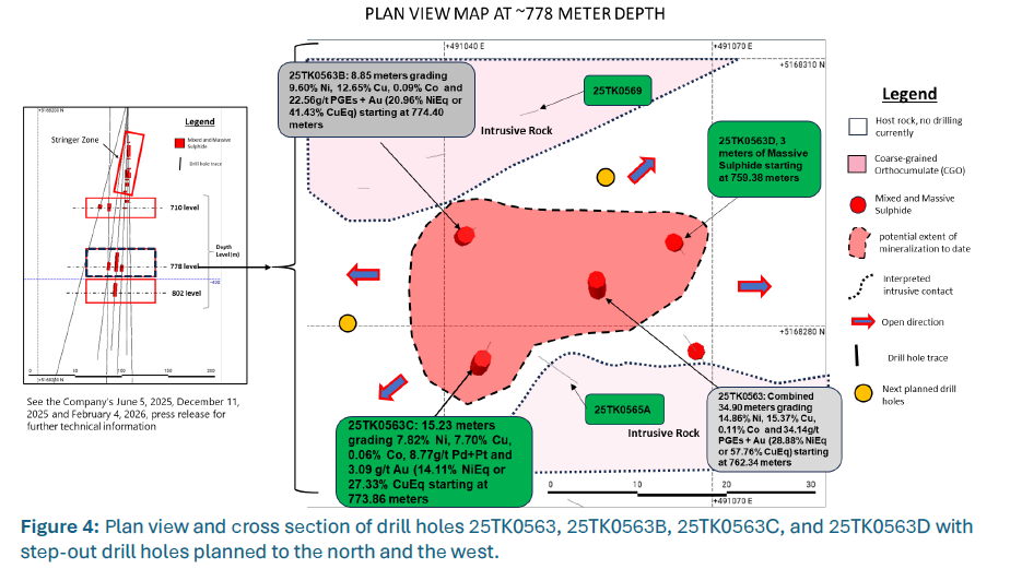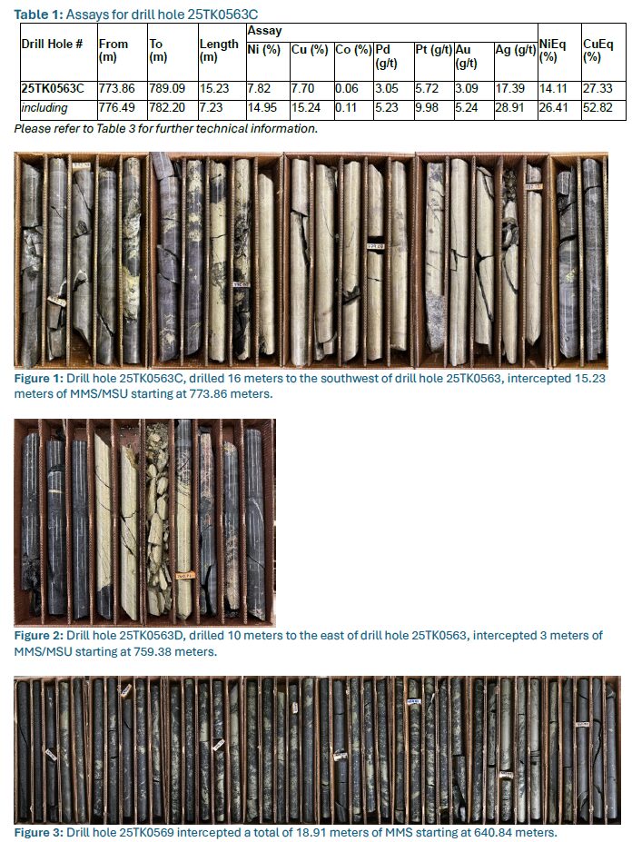 - Assay results for drill hole 25TK0563C, drilled 16 meters to the southwest of drill hole 25TK0563, intercepted 15.23 meters starting at 773.86 meters, which assayed 7.82% Ni, 7.70% Cu, 0.06% Co, 8.77 g/t Pd+Pt and 3.09 g/t Au (14.11% NiEq or 27.33% CuEq) with full results as follows in Table 1. (See Figure 1 and Table 1).
