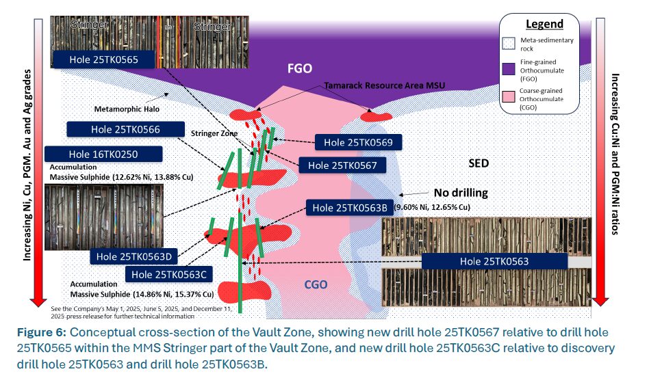 - New drill hole 25TK0569 in the Stringer Zone, intercepted 18.91 meters of MMS Stringers starting at 640.84 meters. (See Figure 3). This hole is a 17-meter step-out from 25TK0565, which previously intercepted 19.11 meters grading 2.38% Ni, 4.72% Cu, 0.03% Co, 3.80g/t Pt+Pd and 2.32g/t Au (6.39% NiEq or 11.67% CuEq) starting at 670.00 meters.