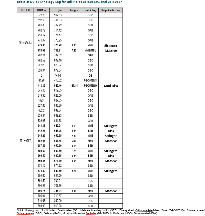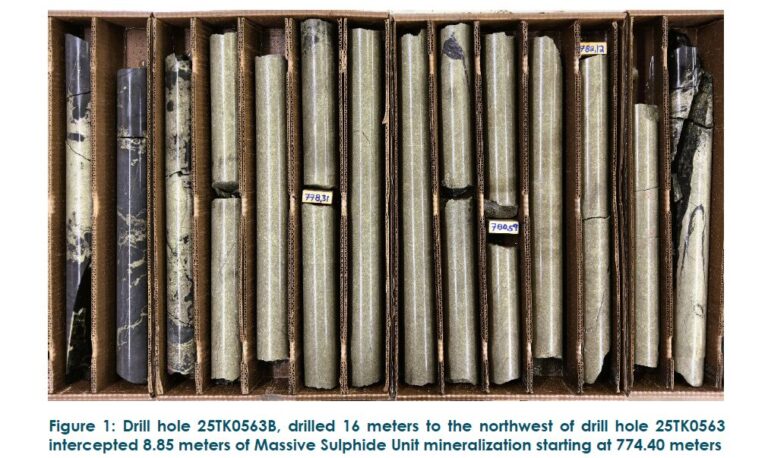 New drill hole 25TK0563C, drilled 16 meters to the southwest of drill hole 25TK0563, intercepted 8.26 meters of MSU and Mixed Massive Sulphides (“MMS”) (assays pending) at the same stratigraphic horizon as the upper part of drill hole 25TK0563 and at a similar depth to drill hole 25TK0563B, starting at 773.95 meters (see Figure 2).