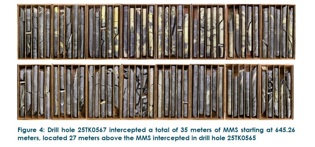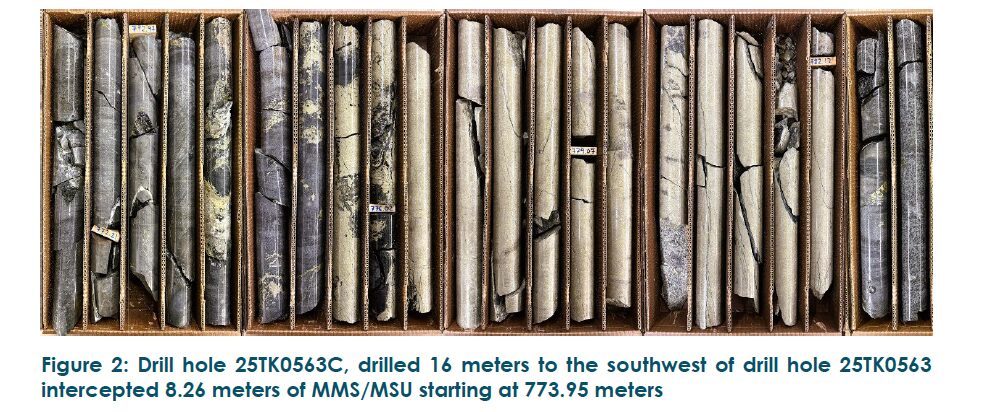 New drill hole 25TK0563C (see Figure 2) intercepted 8.26 meters of MMS and MSU mineralization starting at 773.95 meters. This intercept, located 15 meters south of drill hole 25TK0563B, represents a 16-meter step-out to the southwest of the upper part of discovery drill hole 25TK0563. Mineralization remains open in all directions, and additional drill holes are planned to the north and to the east of drill hole 25TK0563 (see Figure 5).