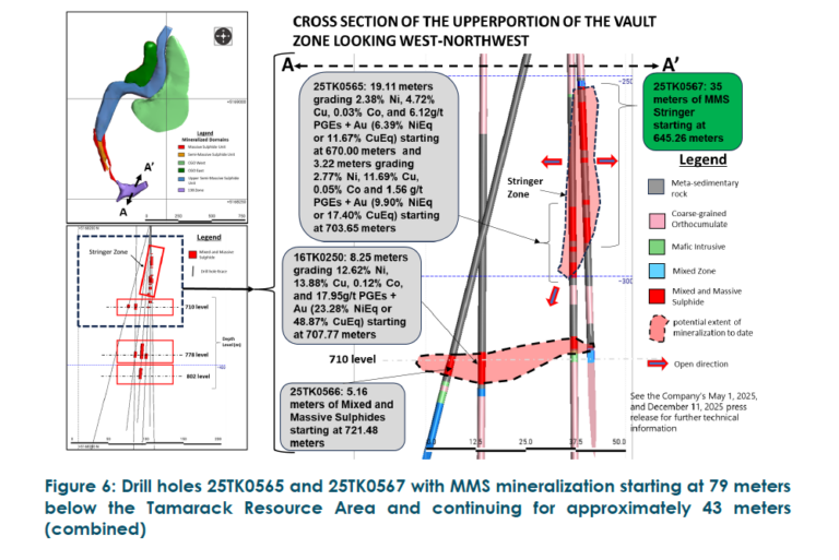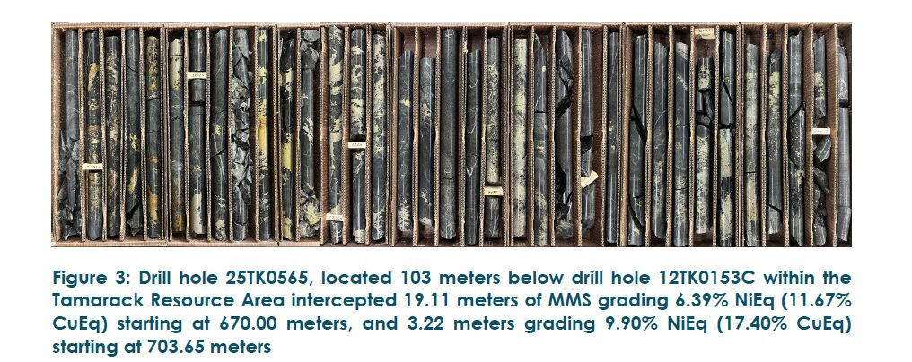 As outlined in the Company’s December 11, 2025 press release, drill hole 25TK0565, located 103 meters below drill hole 12TK0153C (see the November 2022 Technical Report for further details on drill hole 12TK0153C) within the Tamarack Resource Area, intercepted 19.11 meters of MMS grading 6.39% NiEq (11.67% CuEq) starting at 670.00 meters, and 3.22 meters grading 9.90% NiEq (17.40% CuEq) starting at 703.65 meters (see Figure 3).