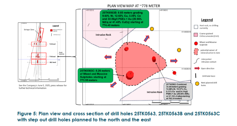 Drill hole 25TK0563B Intercepted 8.85 Meters of Mineralization Starting at 774.40 meters, Grading 9.60% Ni, 12.65% Cu, 0.09% Co, 11.44g/t Pd+Pt and 11.12 g/t Au (20.96% NiEq or 41.43% CuEq)
